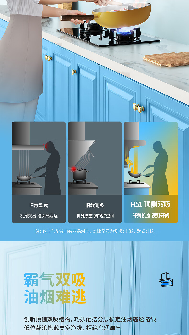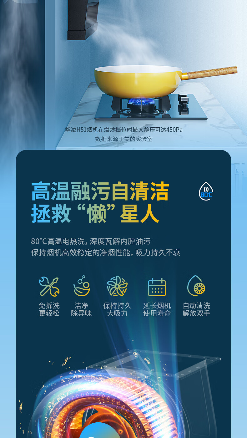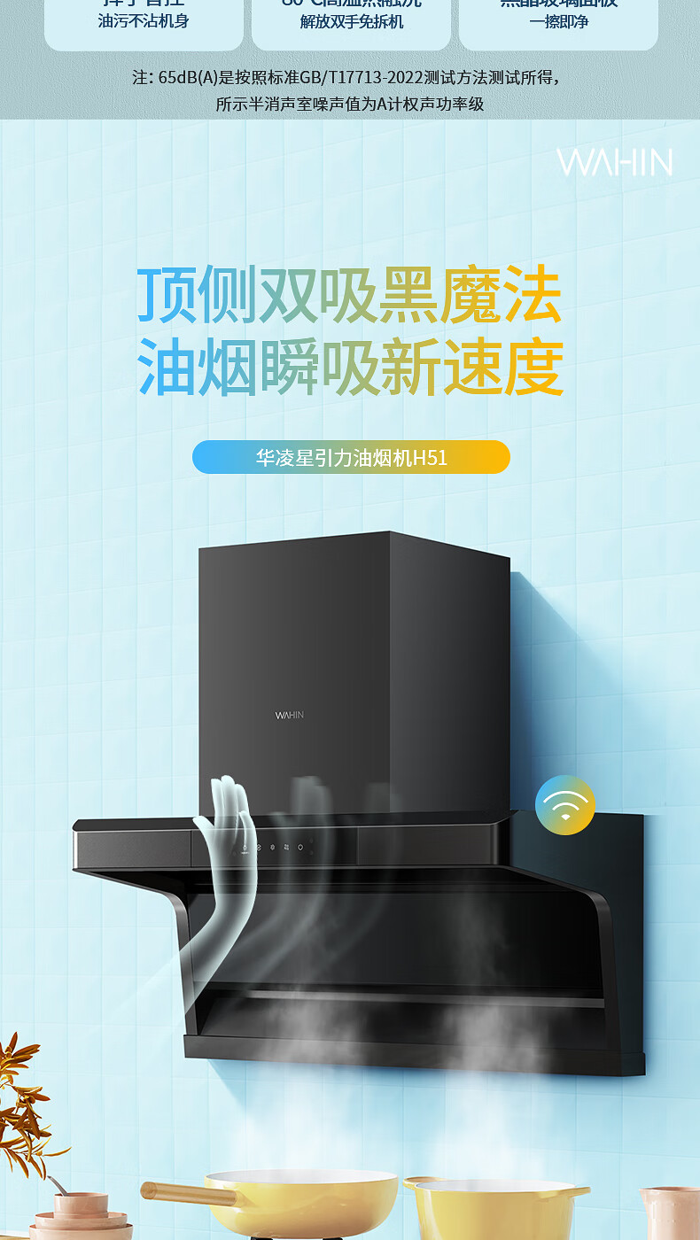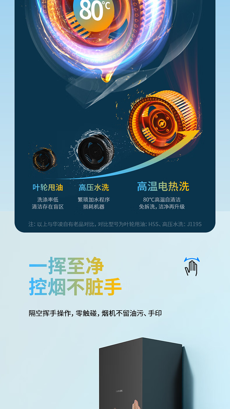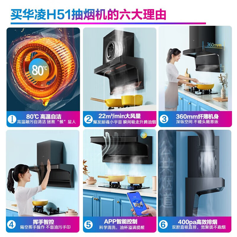 华凌H51抽油烟机7字型顶侧双吸22立方爆炒大吸力家用吸油烟机高温电热洗挥手感应智控星引力 华凌油烟机H51