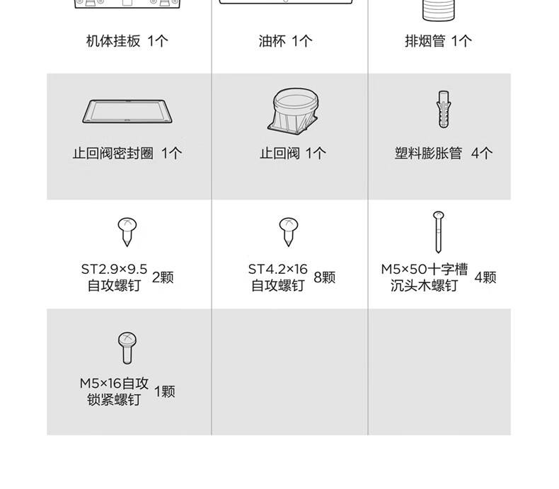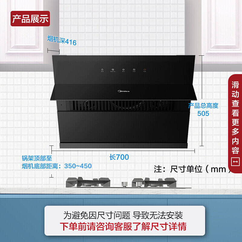 • 烟机外机尺寸: 长700mm;宽505mm;高416mm