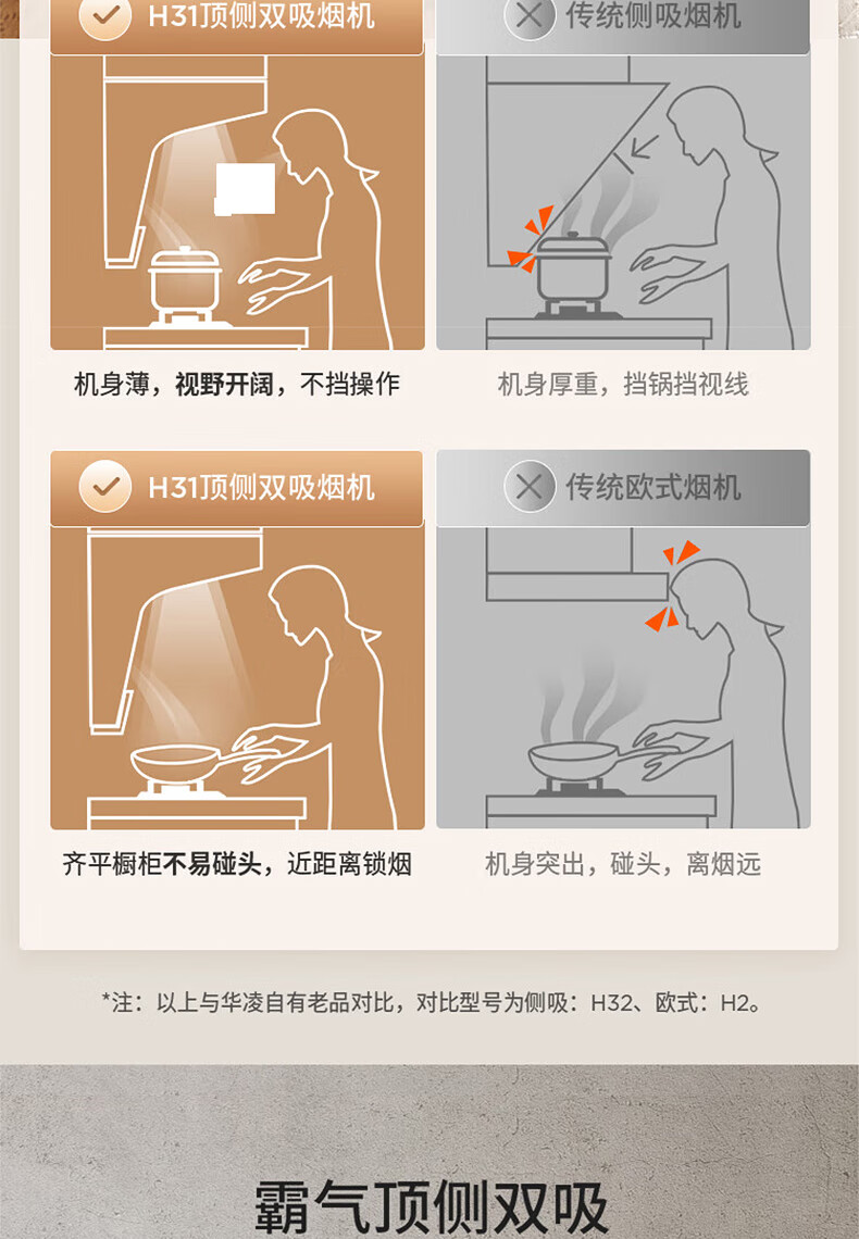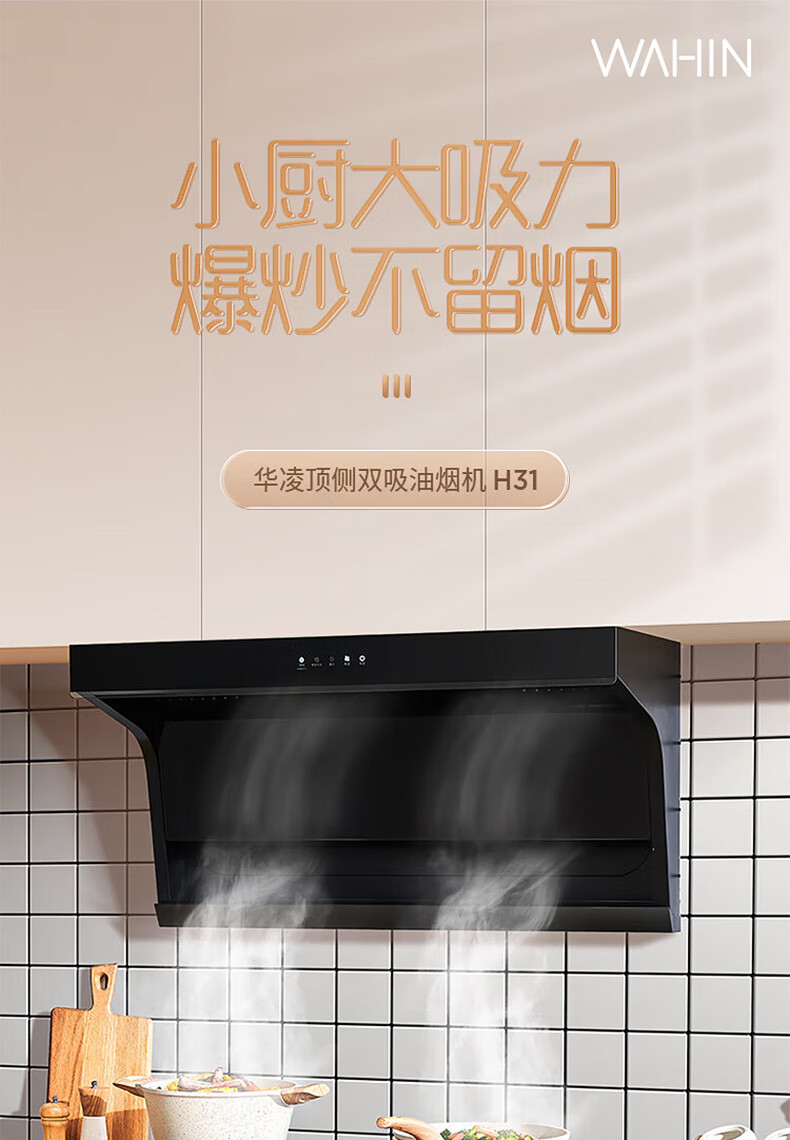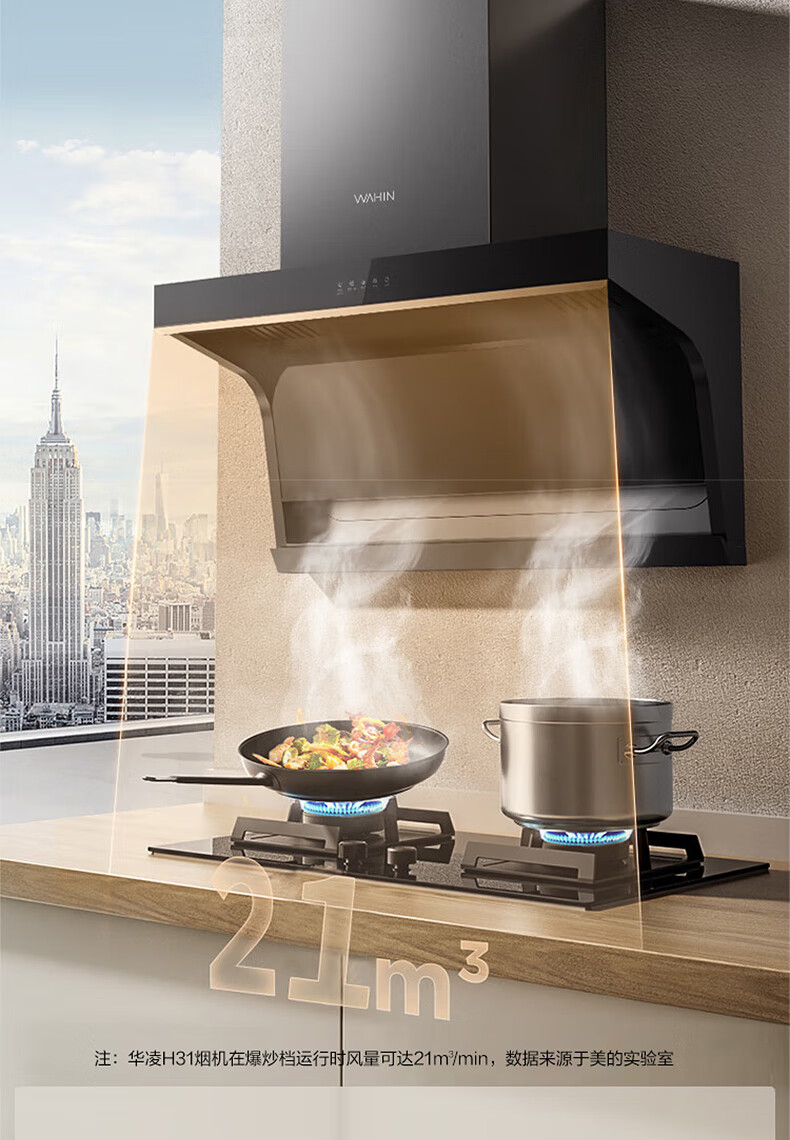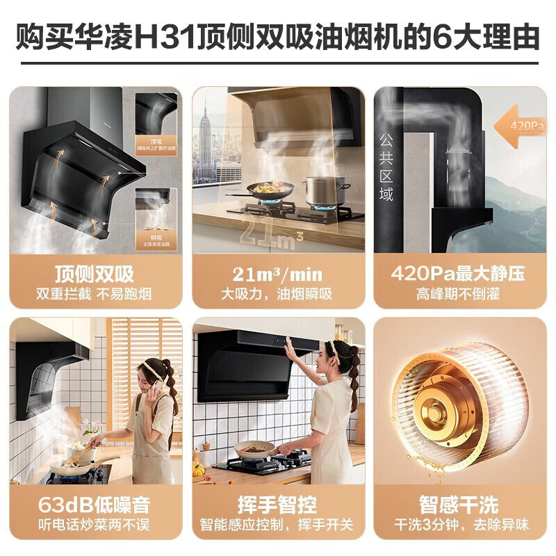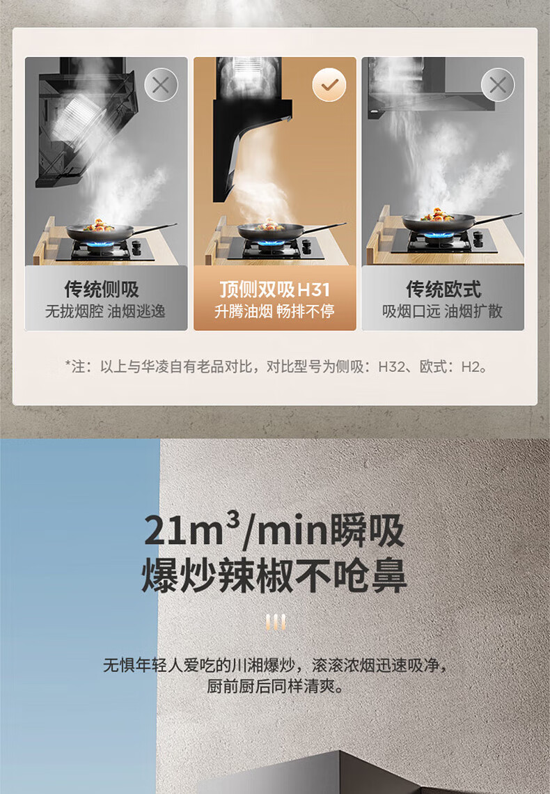 华凌H31抽油烟机顶侧双吸7字形家用吸油烟机21立方米风量大吸力挥手操控智能干洗 华凌油烟机