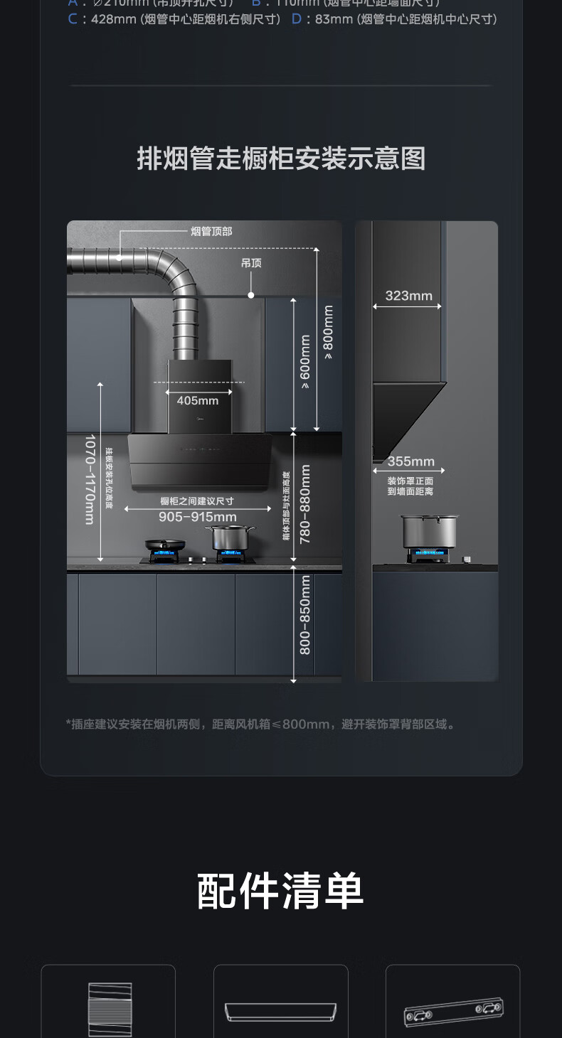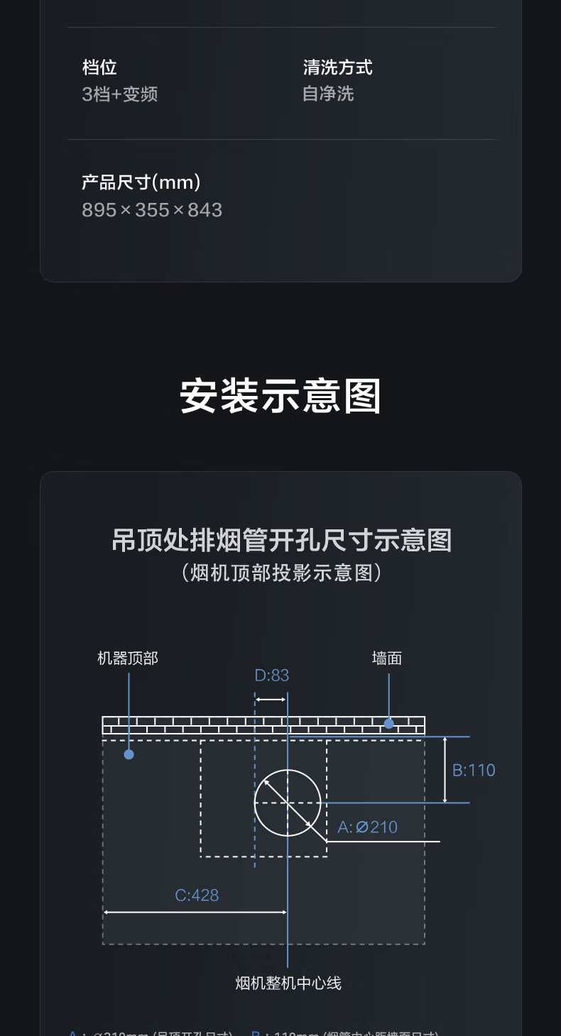 • 烟机外机尺寸: 长895mm;宽355mm;高843mm