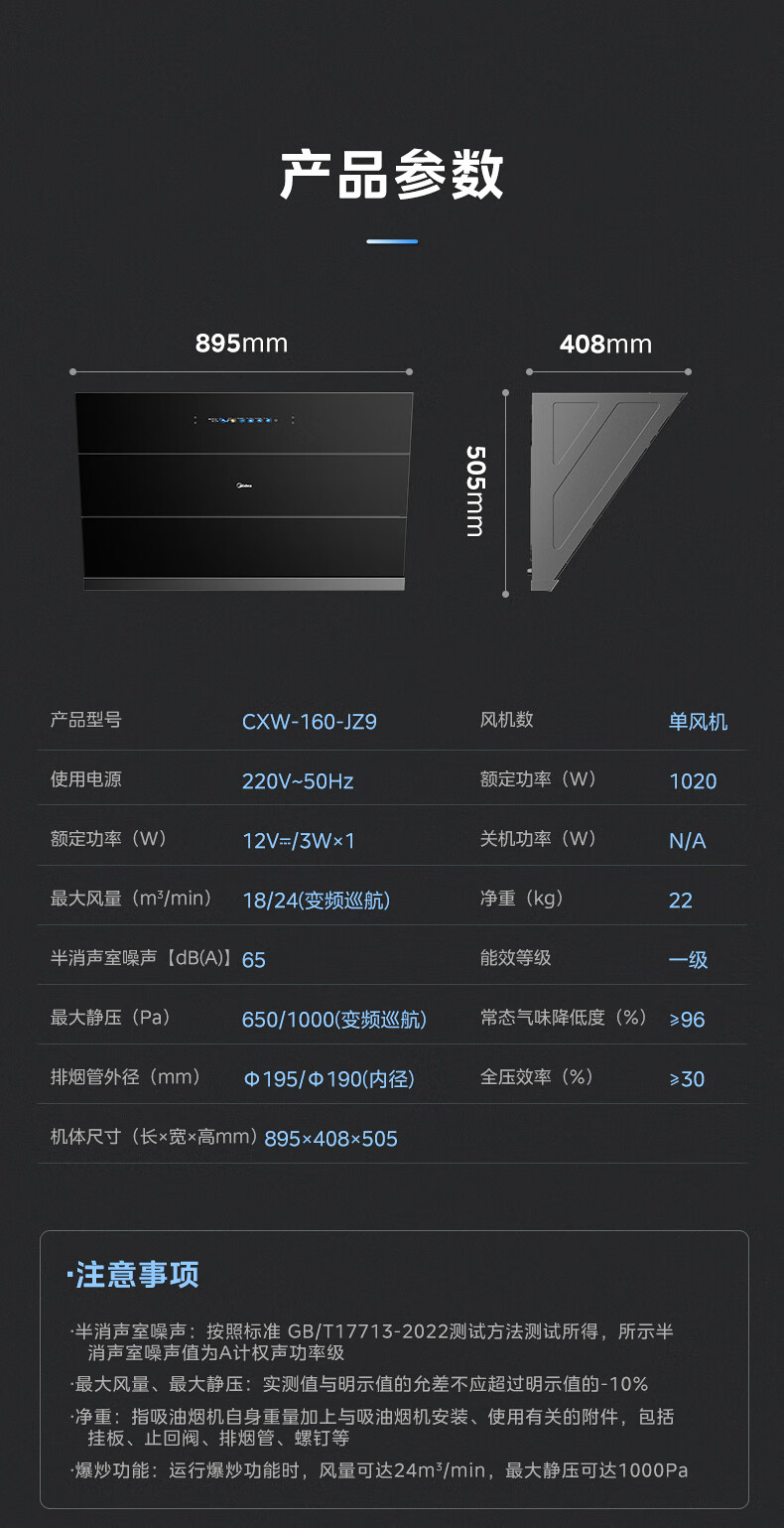 • 烟机外机尺寸: 长895mm;宽408mm;高505mm