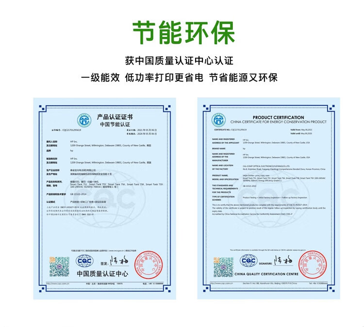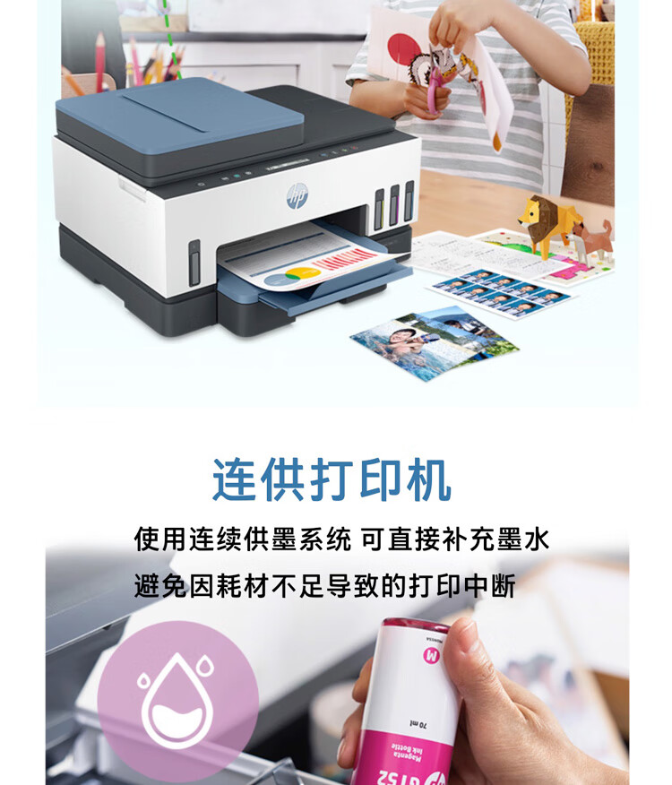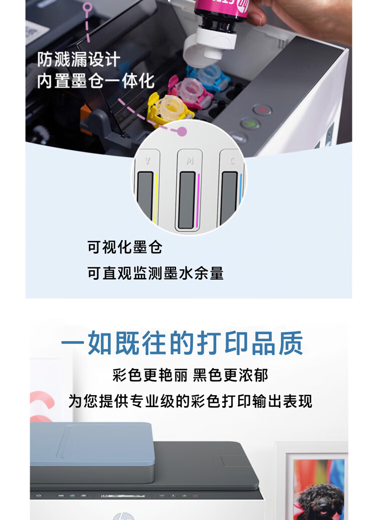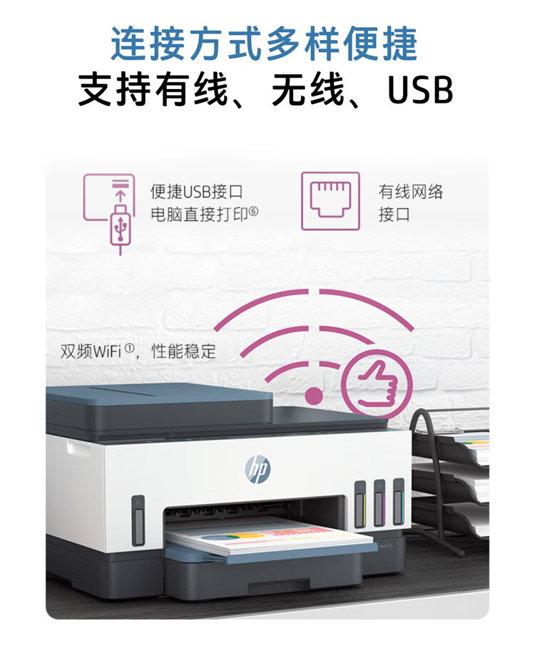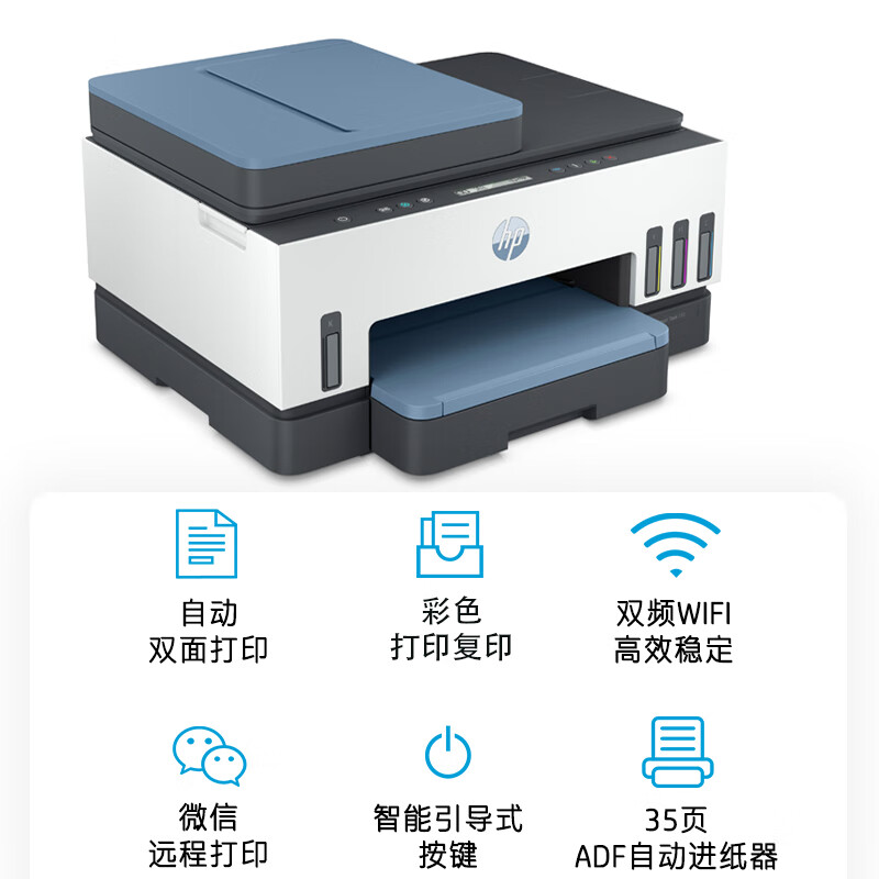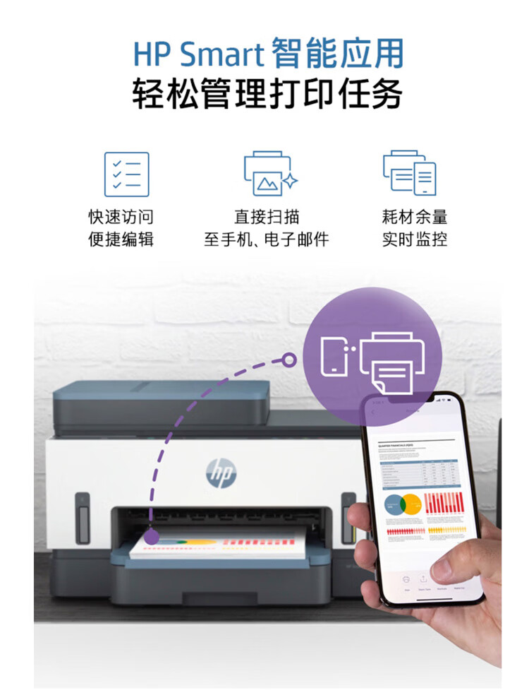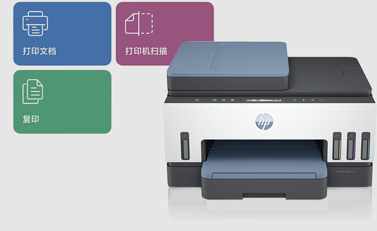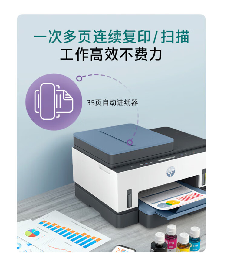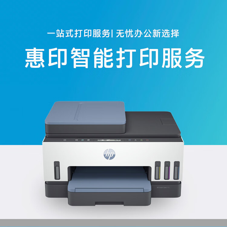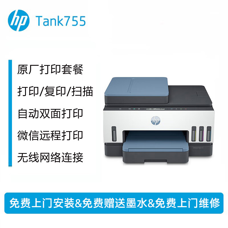 HP Smart Tank 755惠普连供无线打印一体机*1;惠普HP GT53XL黑色原装墨水瓶*1;惠普GT52青色原装墨水瓶*1;惠普HP GT52品红原装墨水瓶*1;惠普HP GT52黄色原装墨水瓶*1;USB传输线*1;电源线 *1,安装指南,参考指南,保修卡