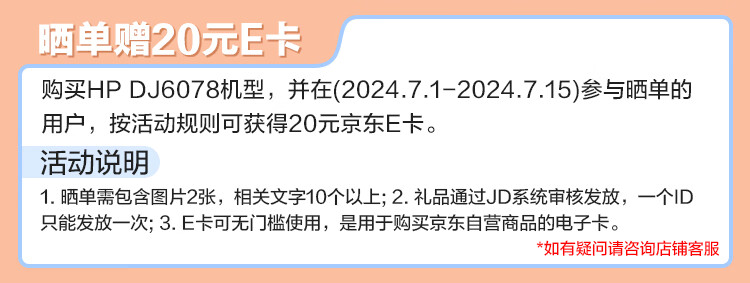 HP DeskJet Plus Ink Advantage 6078惠普家用喷墨一体机*1;初始化黑色&彩色墨盒*1;合规单*1;安装指南*1;参考指南*1;电源线*1