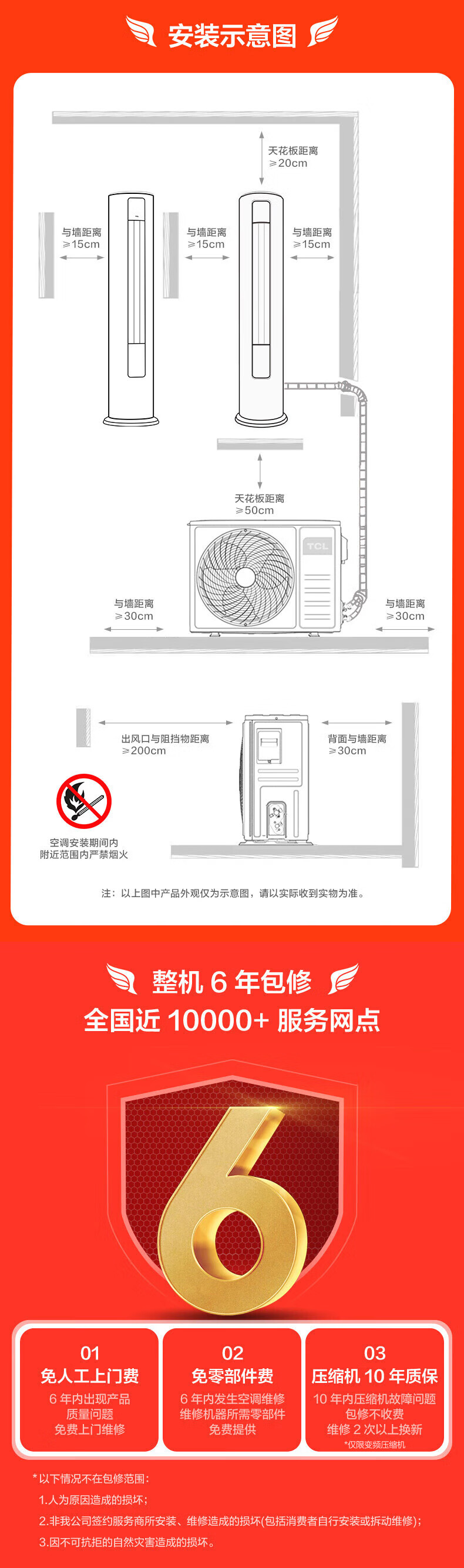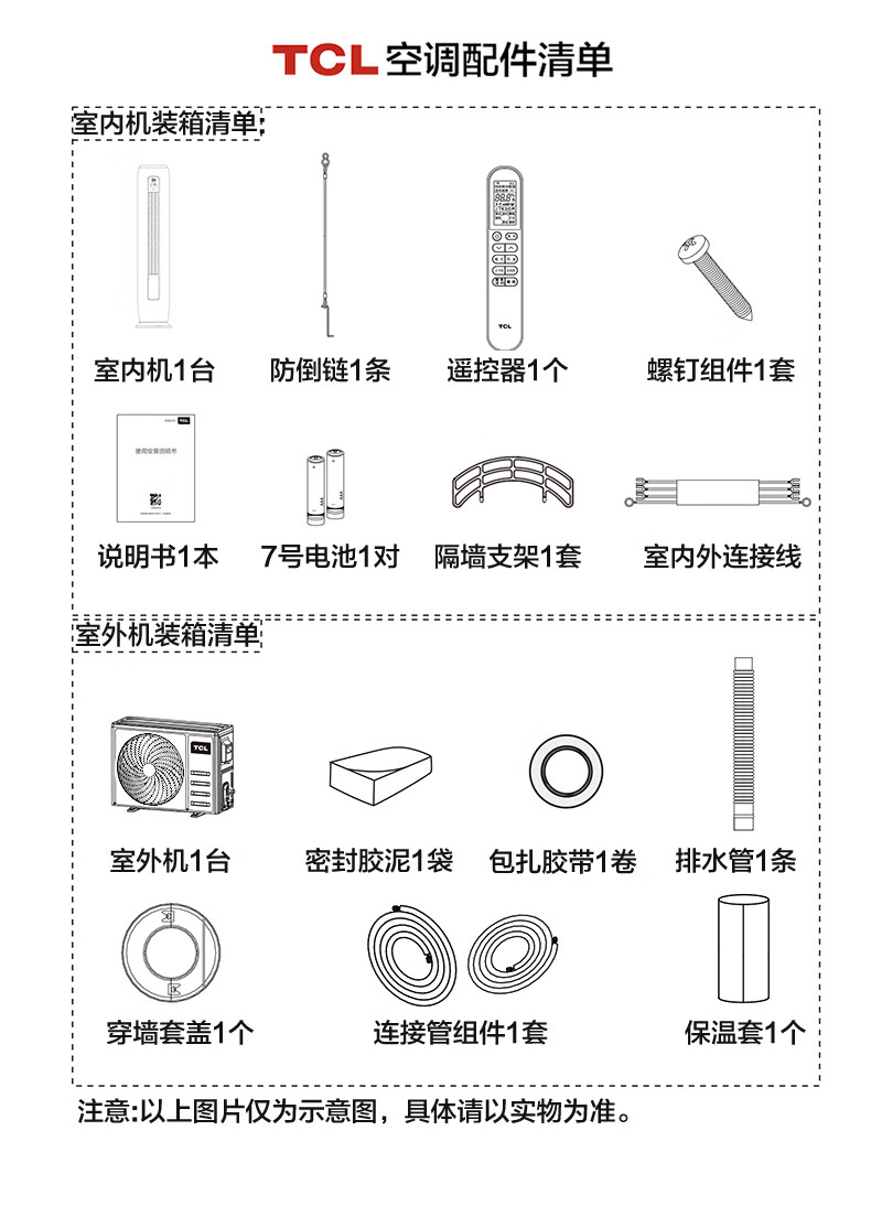 遥控器×1;说明书×1;纯铜连接管×1;TCL空调室外机×1;对应的室内机×1