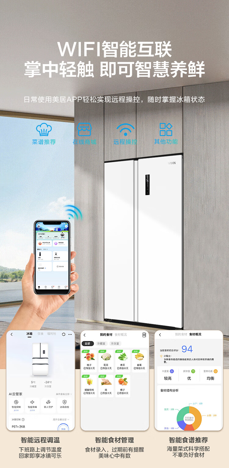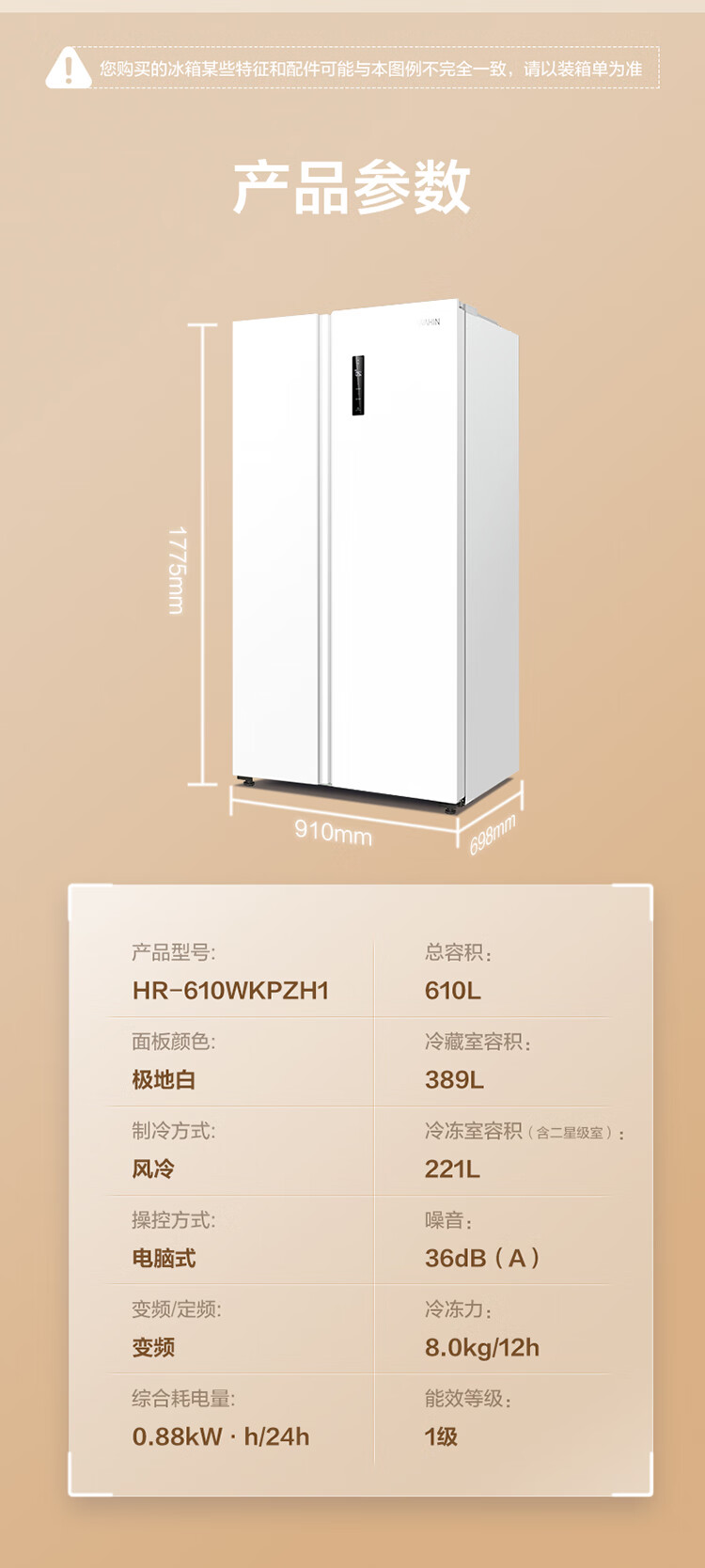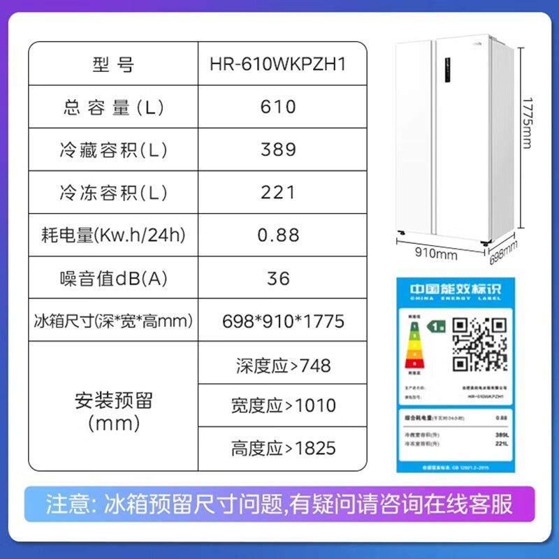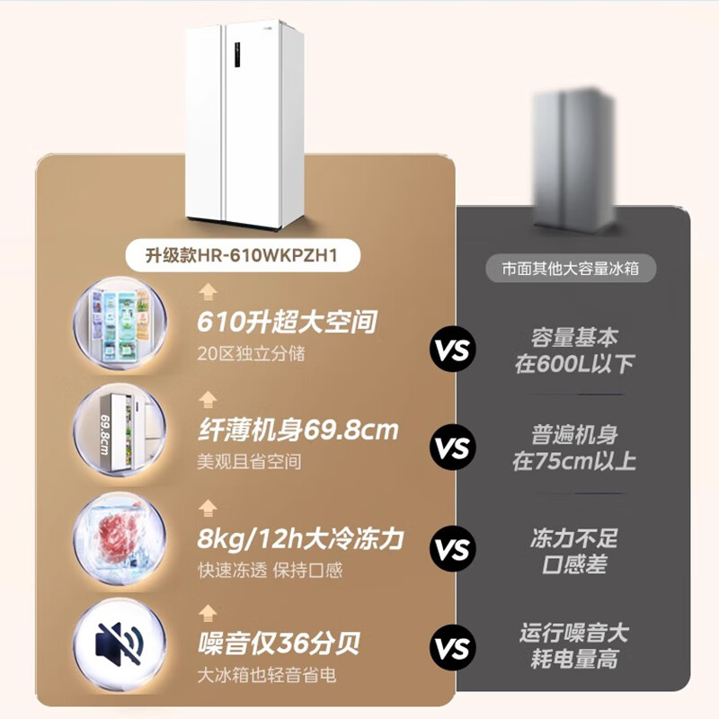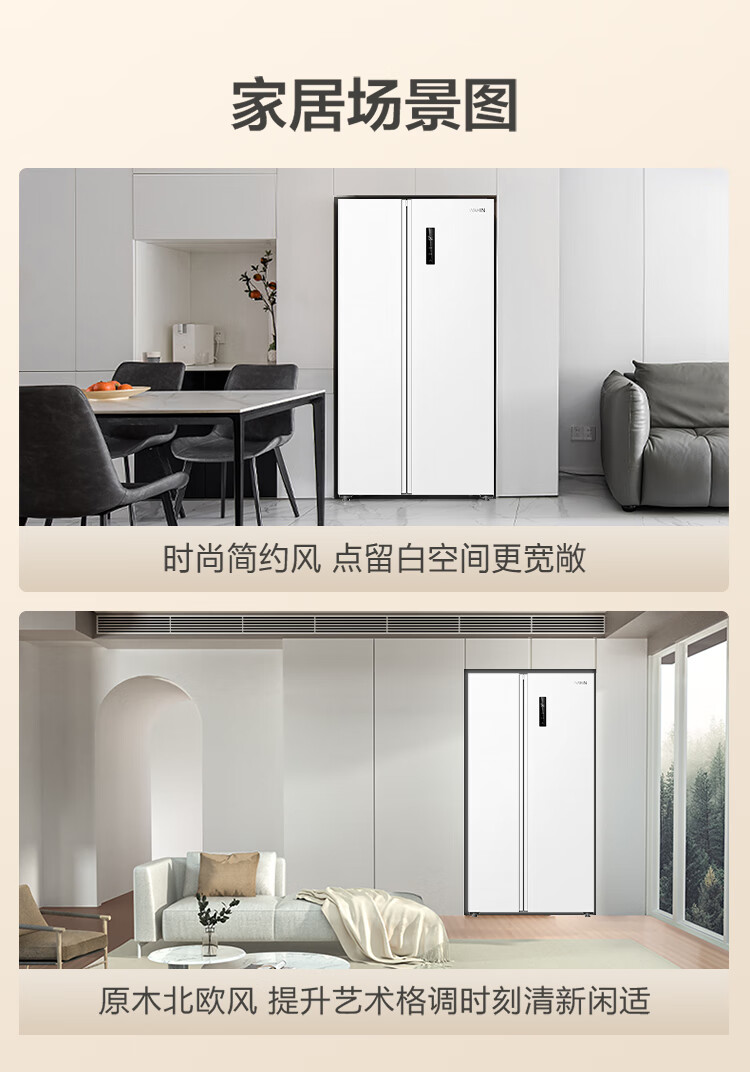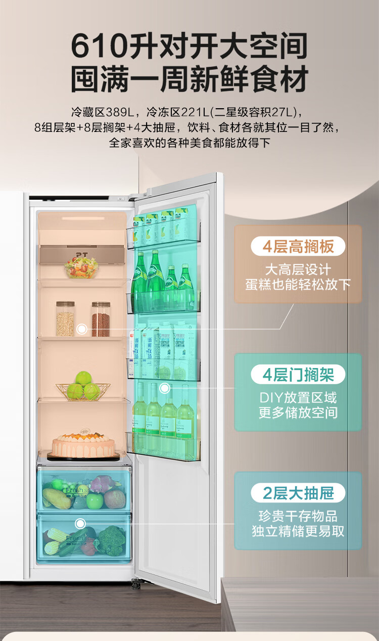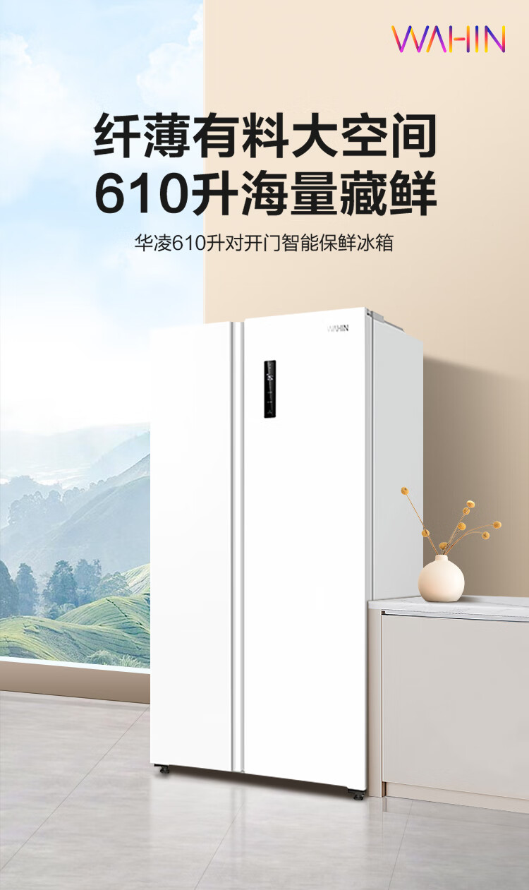 华凌美的出品 610升超大容量对开门双开门一级能效风冷无霜WiFi智能家用电冰箱HR-610WKPZH1白色超薄 610L