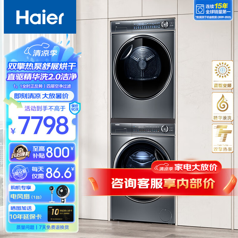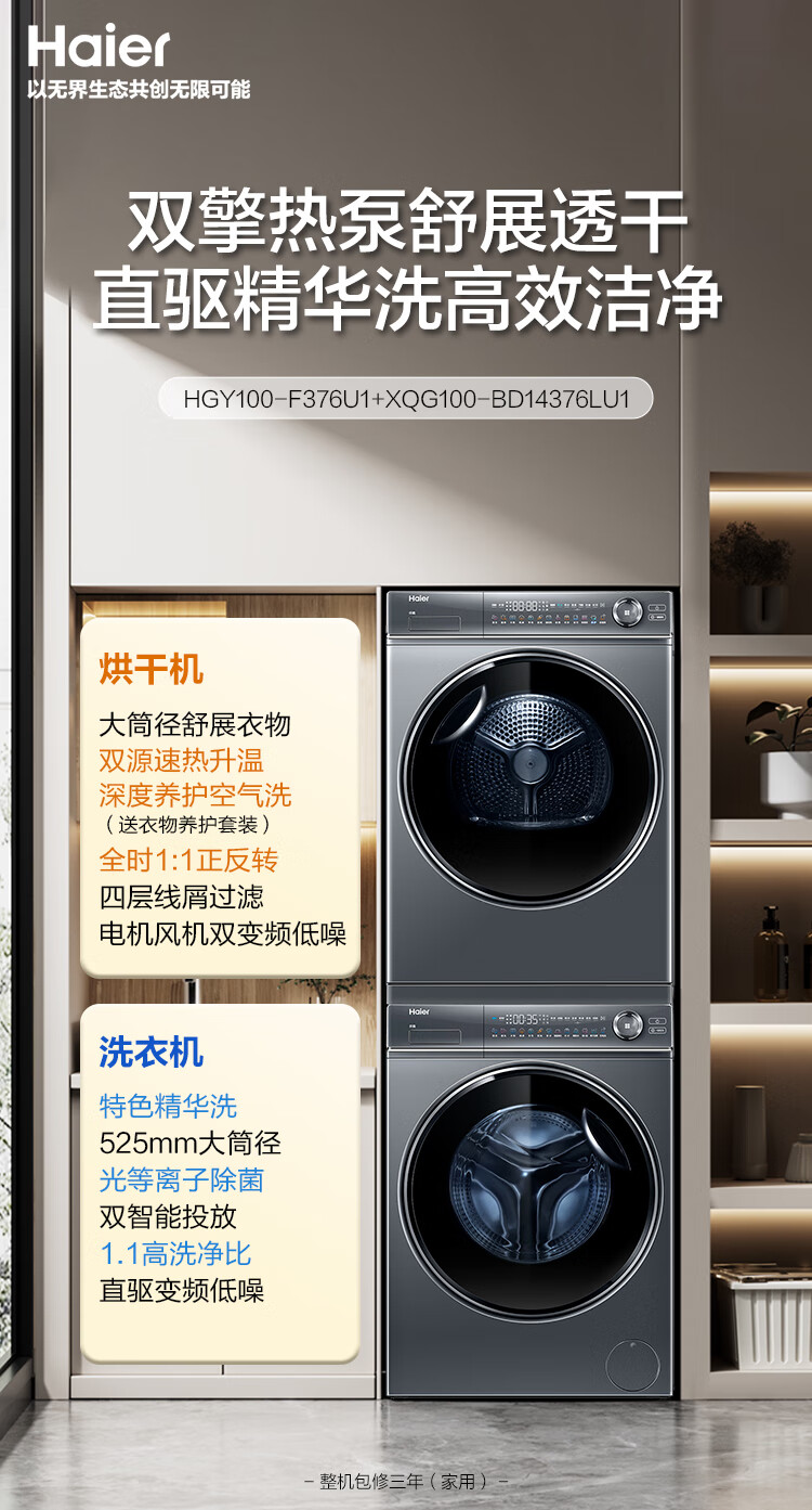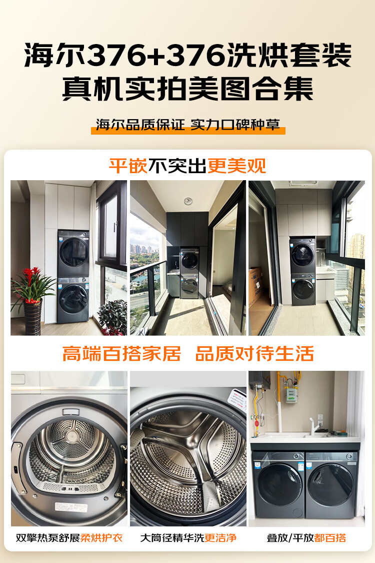 【376+376洗烘套装】海尔云溪376直驱精华洗10公斤洗烘套装纤美超薄全嵌洗衣机双擎热泵烘干衣机